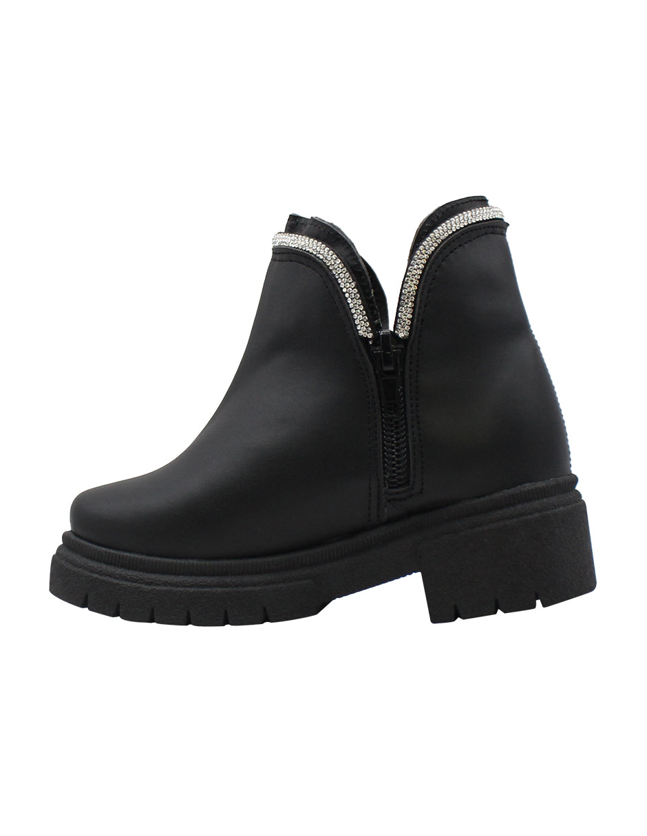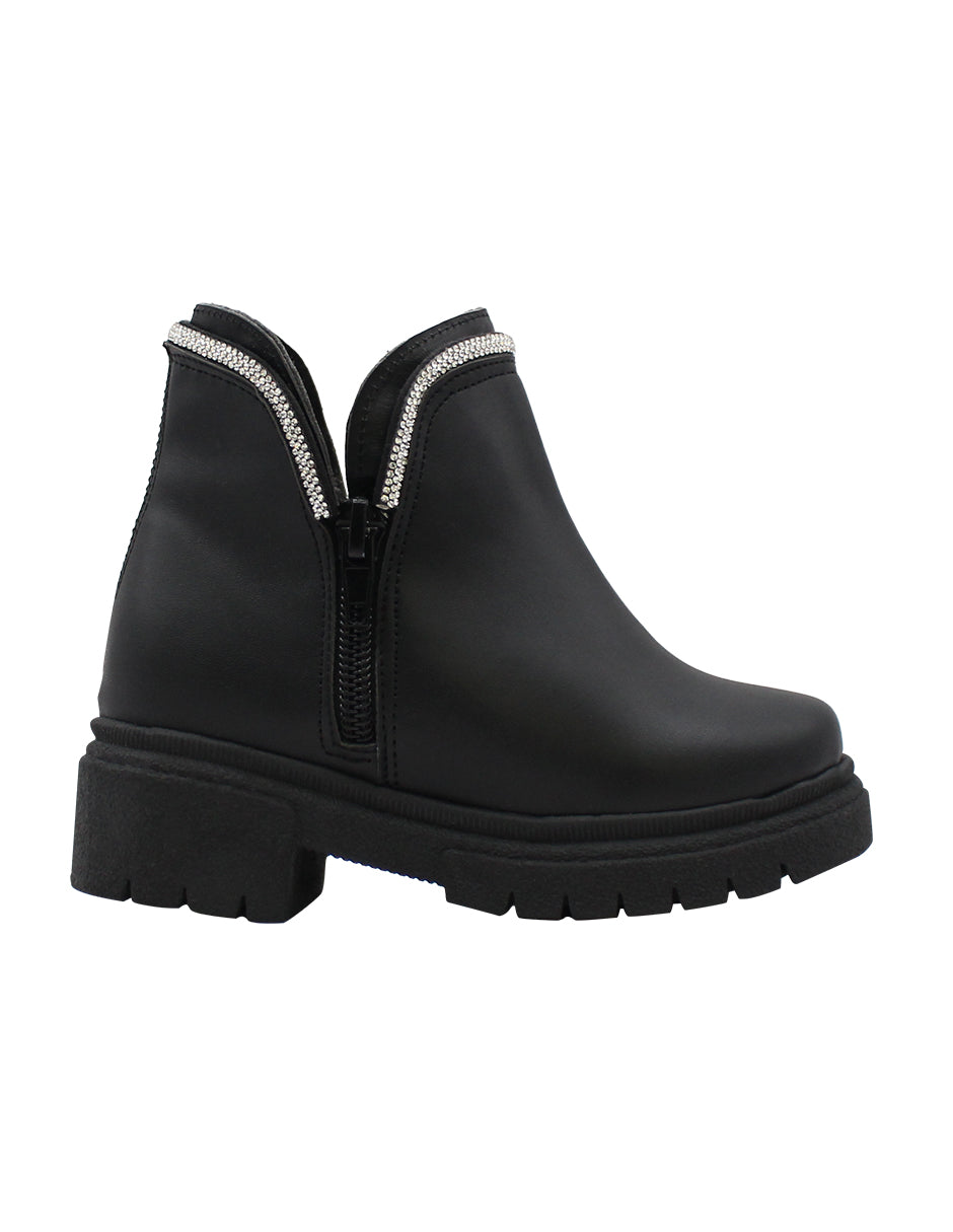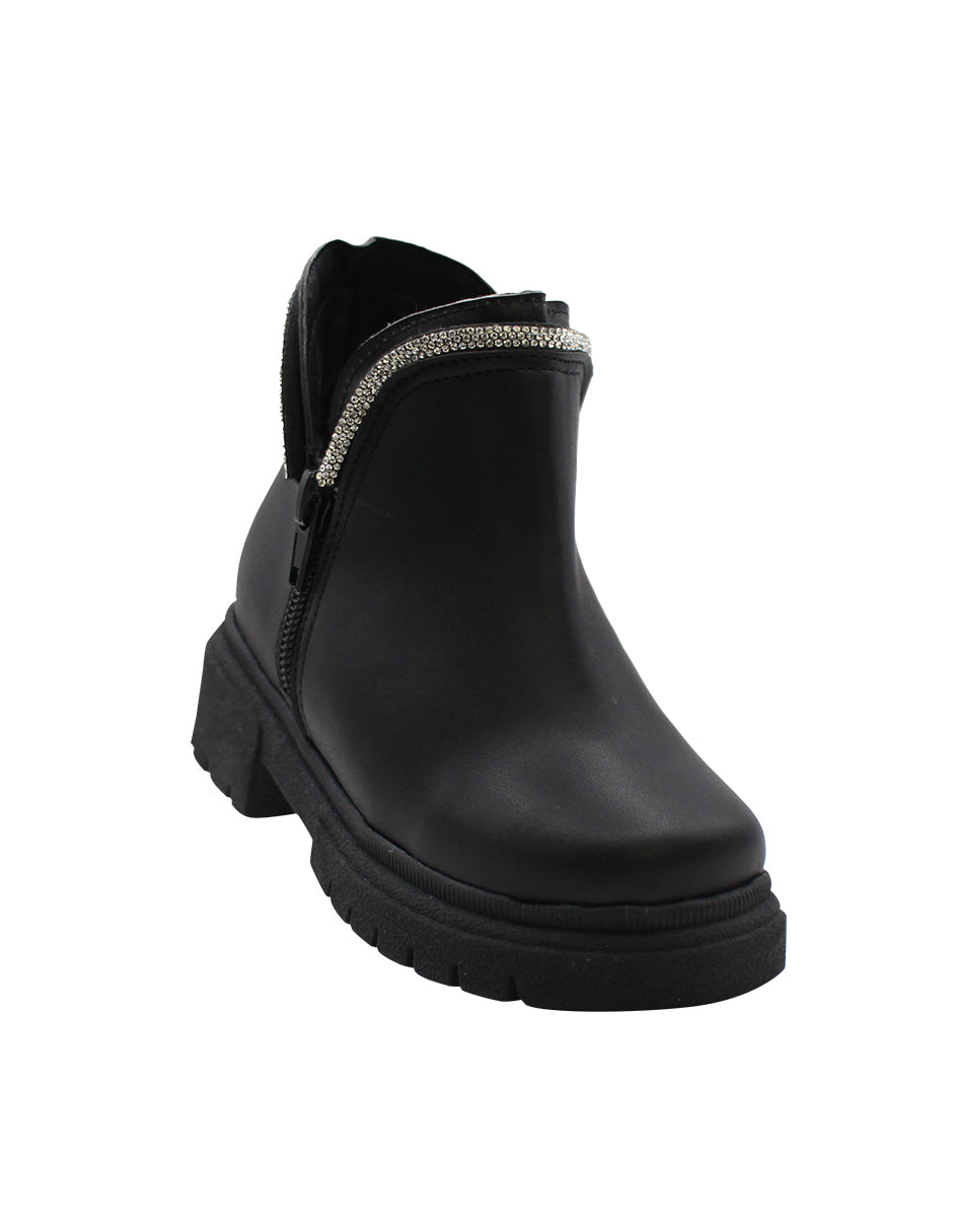 Estas botas negras casuales tienen un diseño moderno con un detalle de brillos que les da un toque divertido y llamativo. Su cierre facilita el ajuste rápido, ideal para que los niños puedan ponérselas y quitárselas sin dificultades. Perfectas para lucir con estilo en cualquier ocasión.