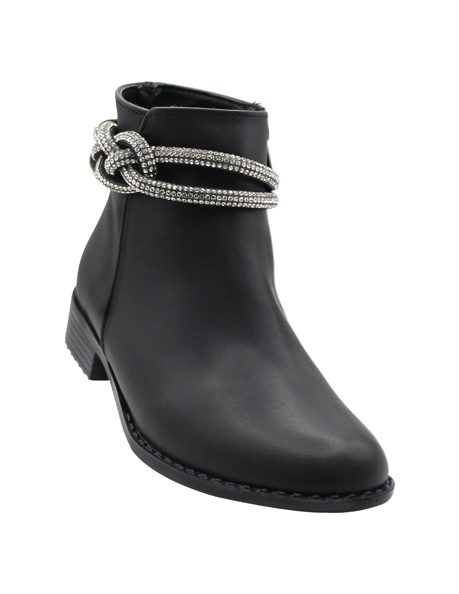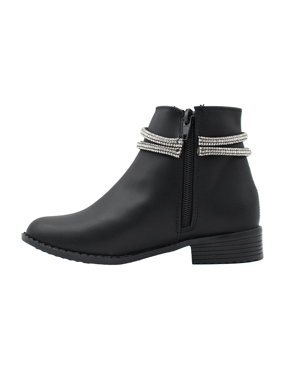 Estas botas negras casuales tienen un diseño moderno con un detalle de correa con brillos que les da un toque divertido y llamativo. Su cierre facilita el ajuste rápido, ideal para que los niños puedan ponérselas y quitárselas sin dificultades. Perfectas para lucir con estilo en cualquier ocasión.