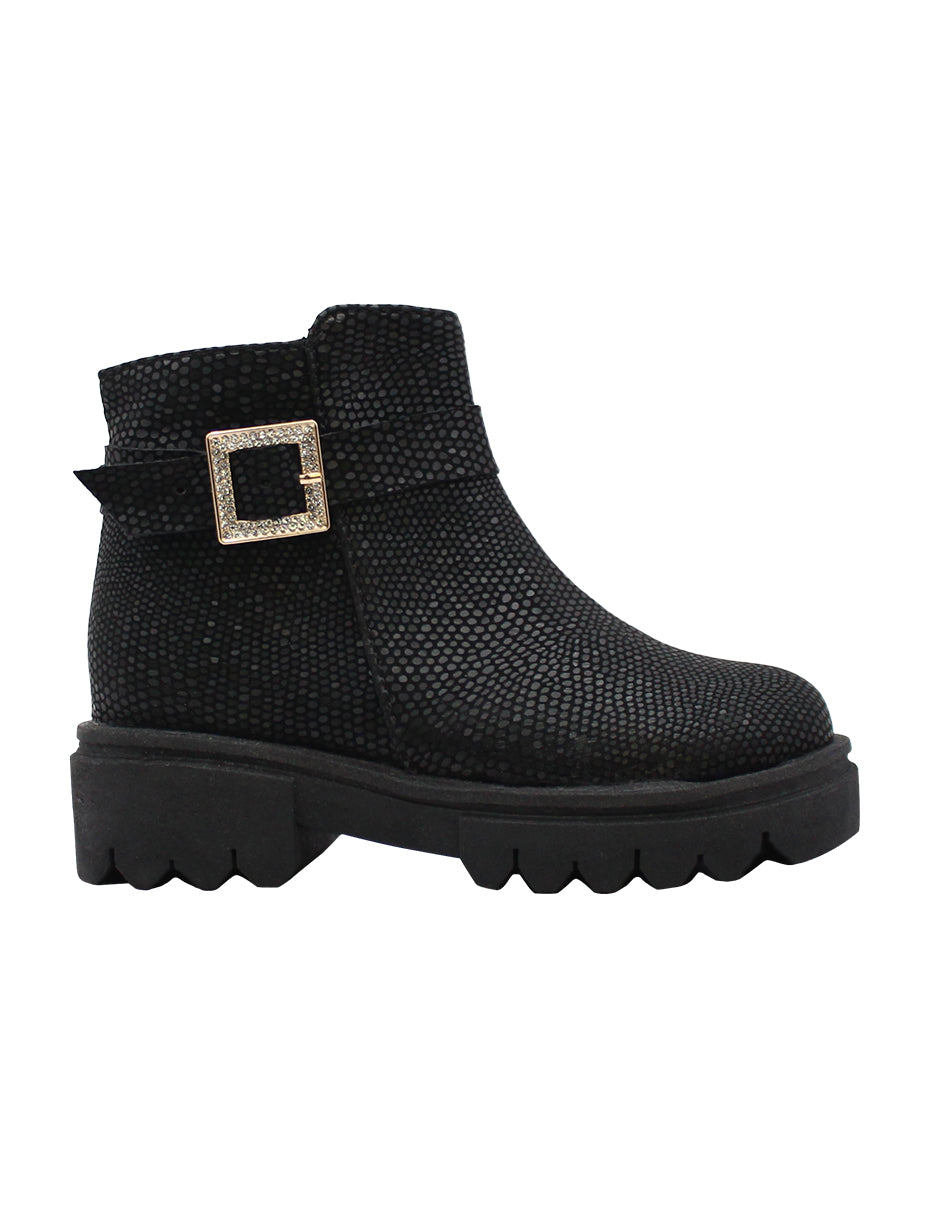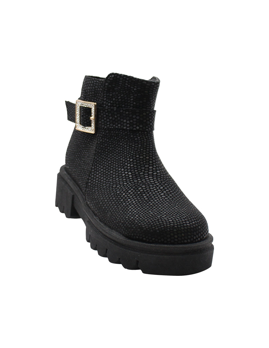 Estas botas negras casuales tienen un diseño moderno con un detalle de hebilla brillante que les da un toque divertido y llamativo. Su cierre facilita el ajuste rápido, ideal para que los niños puedan ponérselas y quitárselas sin dificultades. Perfectas para lucir con estilo en cualquier ocasión.