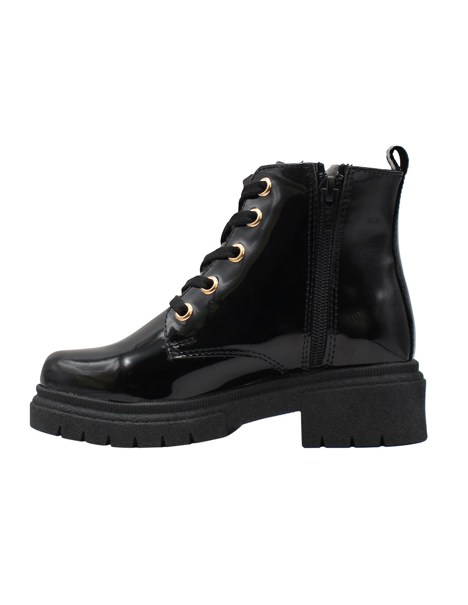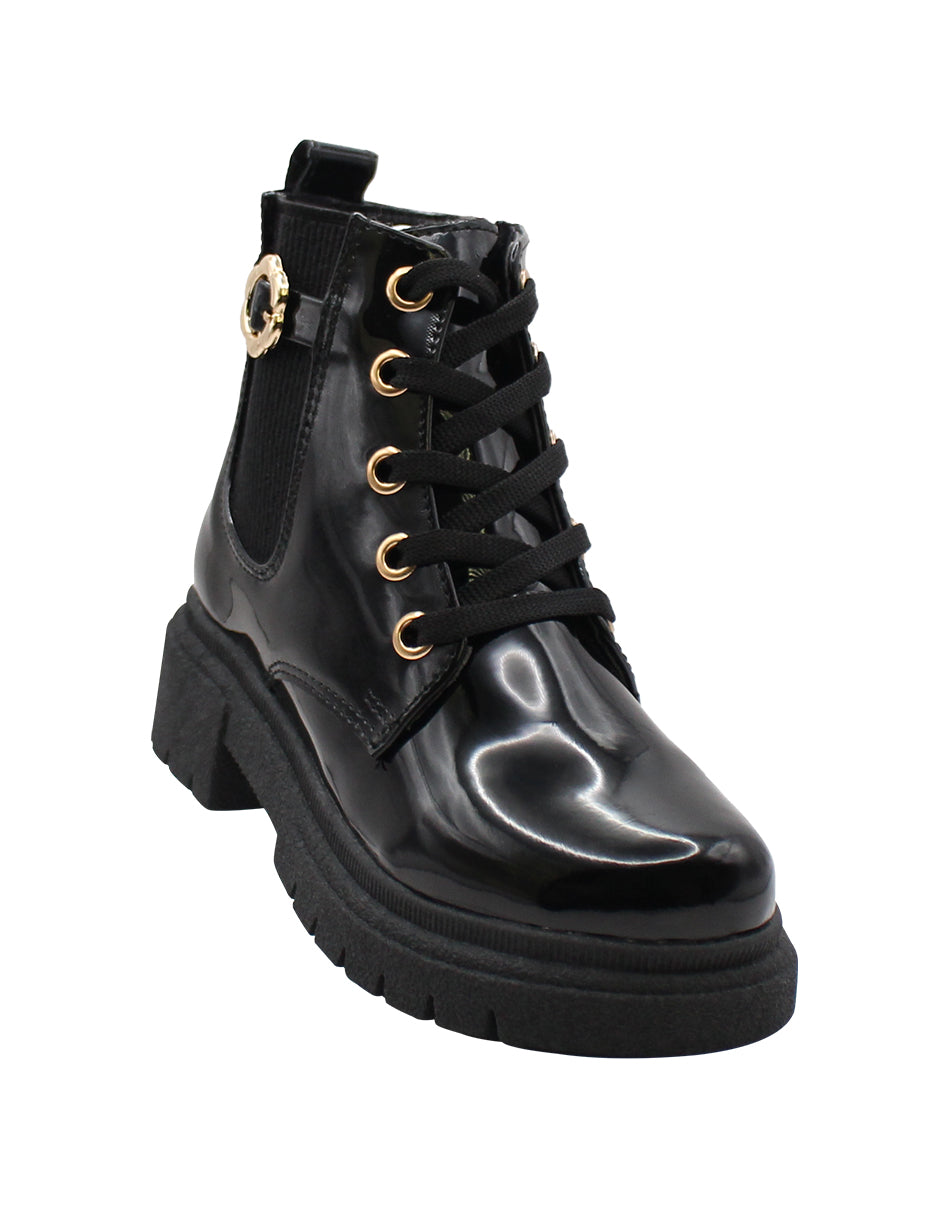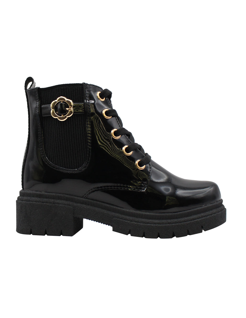 Estas botas casuales en negro charol destacan por su audaz hebilla dorada que añade un toque de elegancia y fuerza. Equipadas con ajuste de cierre, combinan un estilo imponente con la practicidad para quienes se atreven a marcar tendencia con confianza en cada paso.