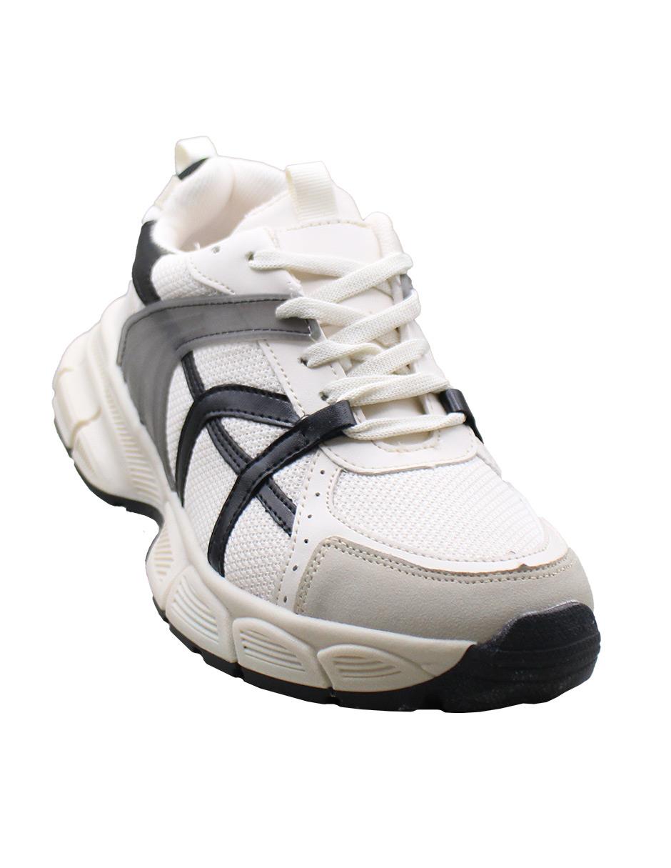 Tenis casual para dama color latte?negro con suela de 4 cm y plataforma de 2.5 cm. Su combinación de tonos neutros y detalles contrastantes aporta un estilo moderno y versátil, ideal para outfits urbanos o de fin de semana.
