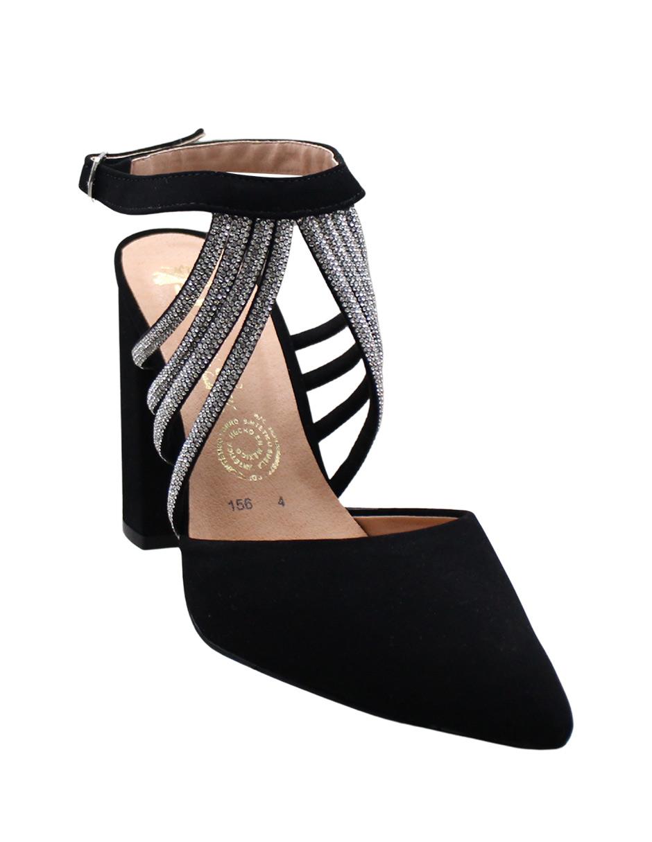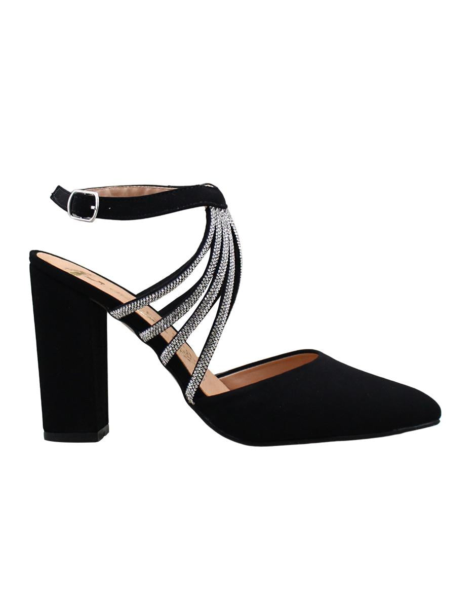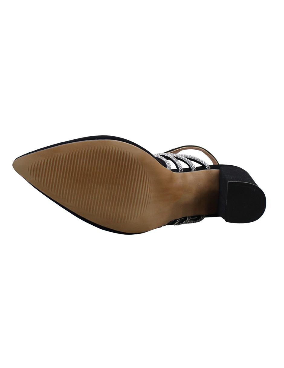 Zapatilla de vestir para dama color negro con tacón de 9 cm y plataforma de 1 cm. Su diseño con tiras brillantes al empeine y pulsera al tobillo brinda soporte y elegancia. Ideal para eventos, fiestas o noches especiales.